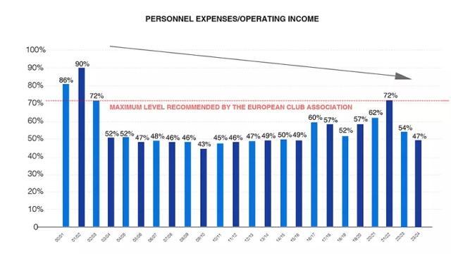 皇马的健康,还体现在运动队的工资占比。2023-24赛季,皇马工资支出占收入的47%,比上一财年(54%)优化了7%,如果不考虑夺冠奖金(包括收入和支出)的影响,2023-24赛季的工资占比为44.5%,这是俱乐部几年来取得的最低数字,远低于欧洲俱乐部协会建议的70%警戒红线。通过不断增加收入和限制支出,皇马在过去20年中一直将比率保持红线以下,即使在疫情的情况下也是如此。