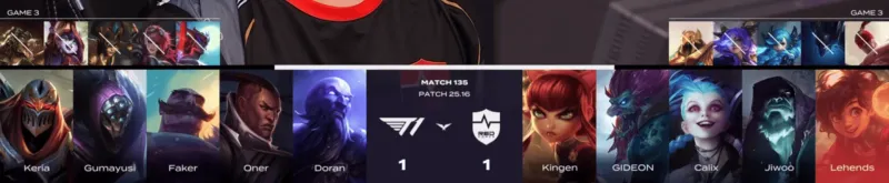 T1选用:Doran贾克斯、Oner劫、Faker瑞兹、Gumayusi卢锡安、Keria布隆